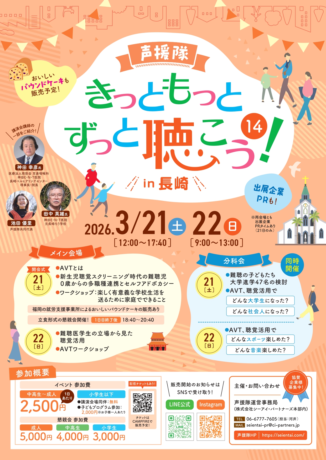 長崎ヘレンの会のメンバーで、当センター特別顧問の神田幸彦先生が1歳から診察している池田優里さんが共同代表を務める「声援隊」(全国の難聴児聴覚活用・AVT療育をする患者・親の会)の講演会「きっともっとずっと聴こう!14」が3/21(土)~22(日)で開催されます。